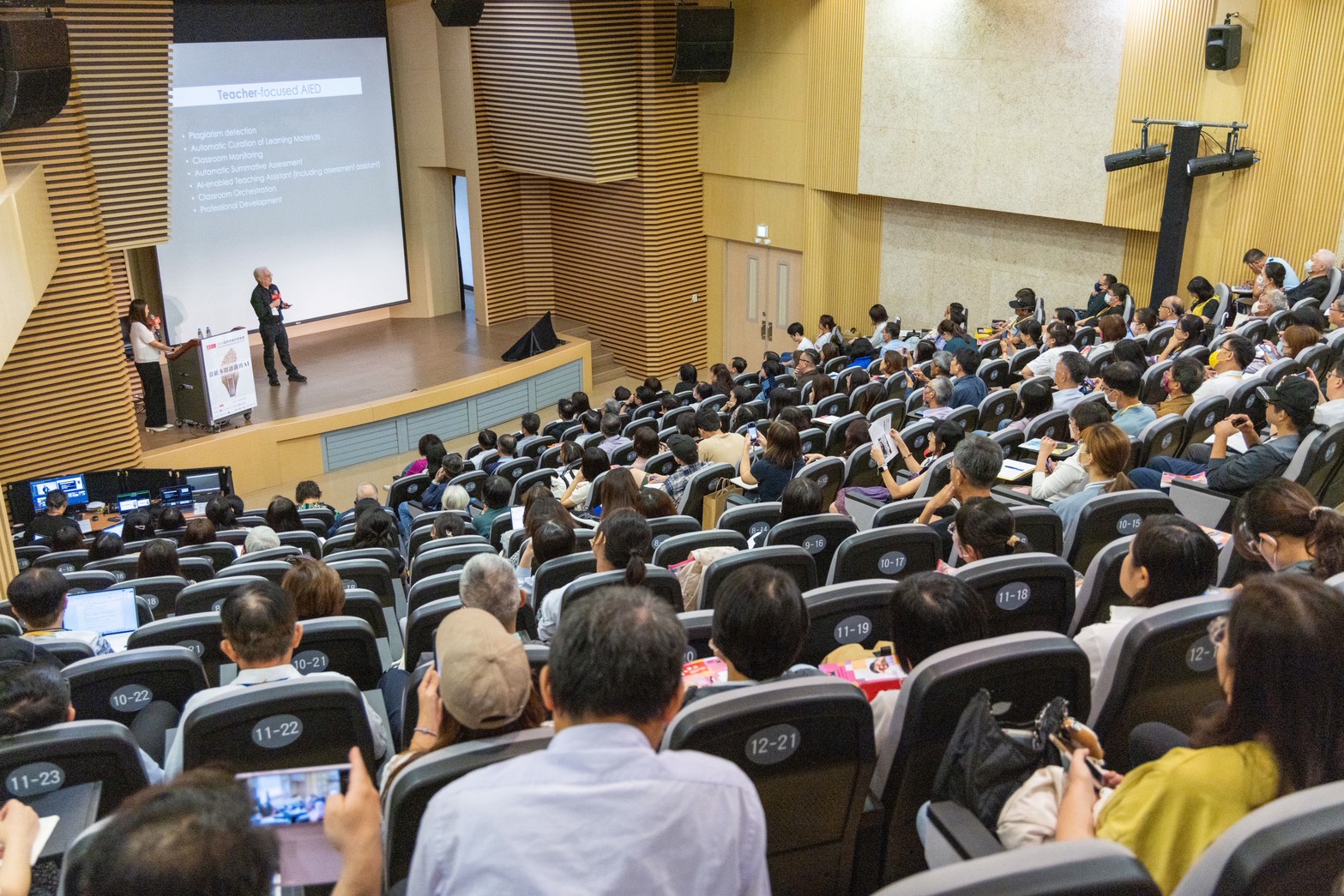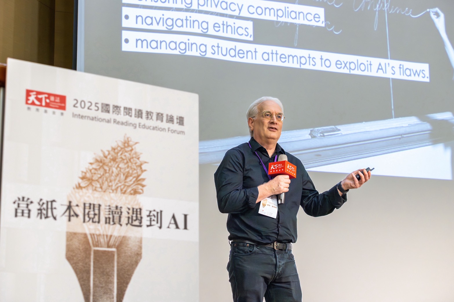 本次論壇的亮點之一,就是邀請到聯合國教科文組織人工智慧教育專家、英國倫敦大學學院(UCL)人工智慧與教育批判研究教授韋恩 ‧ 霍姆斯(Wayne Holmes)親臨現場,依兩大範疇分析AI與教育的關係。第一類為「利用AI進行教學和學習」,稱為「教育中的AI」(AIED);第二類為「關於AI的教學和學習」,也就是涉及AI素養的建立。他認為,AI與教育至關重要,不能只交給技術與商業主導;「教育者必須積極參與,確保它真正服務教師與學習者。」