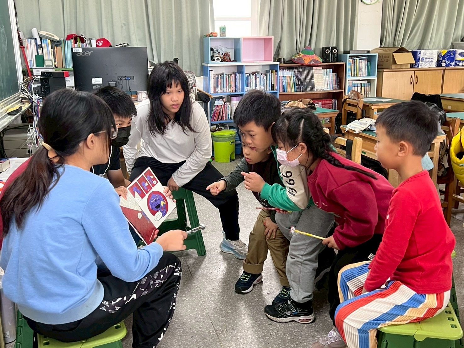 高年級小朋友(左)在「小小說書人」為低年級孩子說故事,設計閱讀討論活動。(桃園市大潭國小提供)