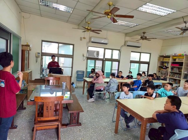 上午九點,我們在成大圖書館集合,做最後的教材與書籍確認,隨即搬運上車出發。大約50分鐘的車程,我們抵達了甲中國小。一進校門,立即感受到校長、主任與老師們的熱情招呼。隨著下課鐘聲響起,操場上傳來孩子們奔跑嬉鬧的聲音,那份充滿活力的喧嘩,讓我們不禁想起自己國小時青澀的模樣,原本的忐忑瞬間轉化為鬥志,迫不及待地想與孩子們展開互動。